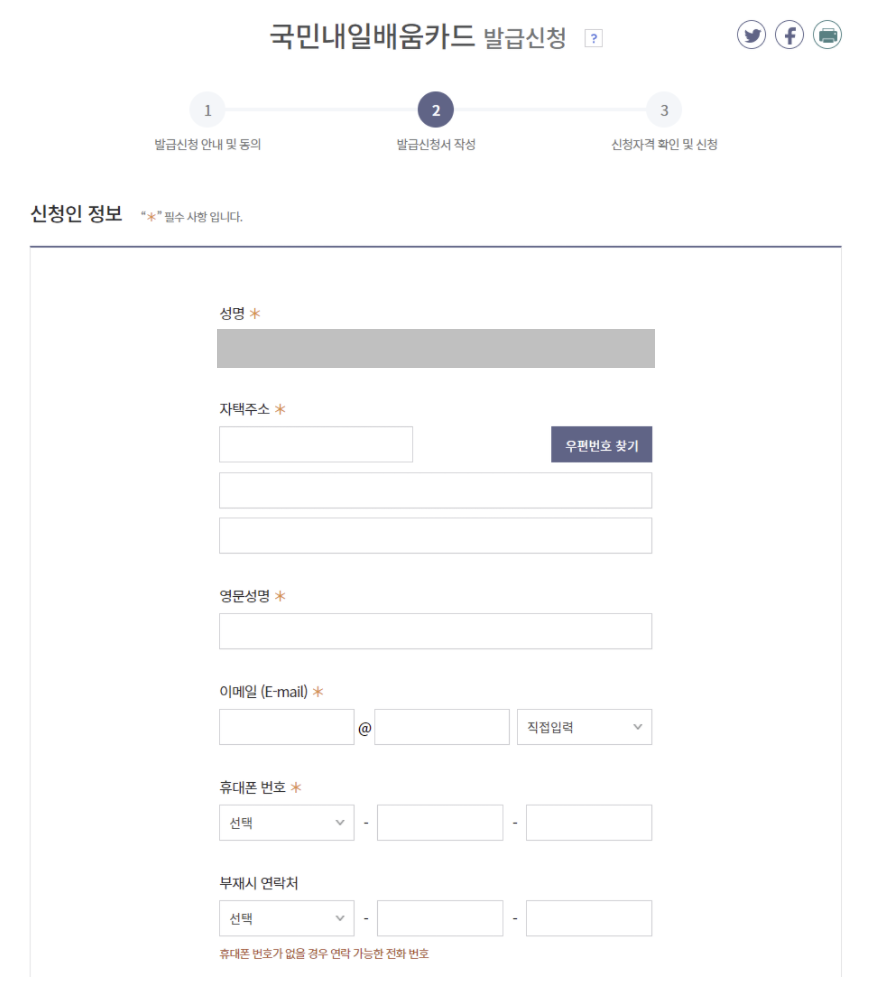 내일배움카드를 발급받을 배송지 정보가 신청인 정보와 동일하다면 신청인 정보와 동일에 체크)