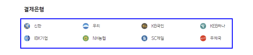 신한은행, 우리은행, KB국민, 하나은행, 기업은행, 농협은행, SC제일, 우체국 (총 8개 대표은행 가능)