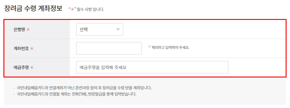 단위기간 중 80% 이상 출석 시 받을 수 있는 훈련장려금을 수령받을 계좌 정보 입력